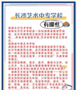 长沙艺术职高学校有湖南长沙艺术学校、湖南省中南艺术学校。