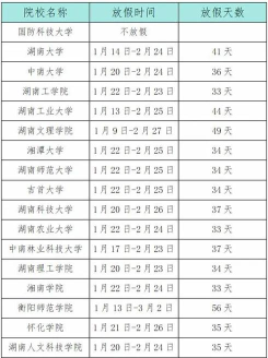 今年的寒假时间长沙是从2023年1月8日开始放起,一直到2月4日结束。岳阳是从2023年1月7日放到2023年2月4日。常德寒假时间定为2023年1月8日至2023年2月4日。娄底中职学校原则上是2023年1月7日开始放寒假,但因有些学校平时月假未休足,如果已经完成了本学期的教学任务,经当地教育局批准可以适当调整放假时间。湘西定为2023年2月7日放寒假。所有地区的寒假时间会根据当地教育行政部门根据实际情况调整。