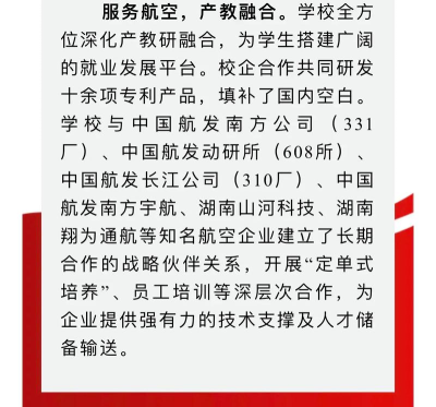 学校拥有航空制造(数控)实训、航空、人工智能、无人机、工业机器人五大实训中心。配备先进的实训设备,围绕航空产业链开设数控技术、飞机维修、工业机器人应用技术、无人机应用技术、航空服务等特色专业。