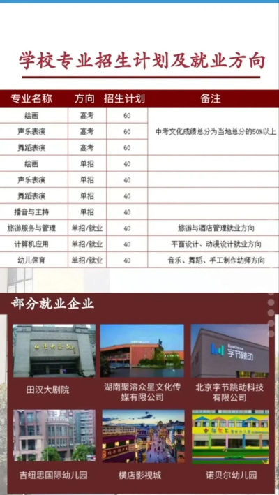 学校创立于2005年,位于长沙经济开发区榔梨工业园,在校学生人数1148人,学校校园环境优美,学校校舍面积近80亩,学校的舞蹈表演专业主要培养学生是德智体全面发展,也开设了相关的音乐乐理知识、基本功、民族舞、现代舞等。舞蹈更注重身材管理,看中身材比例,