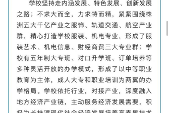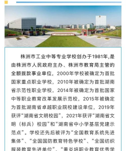 学校是首批的国家重点职校。学校还是湖南省首个开展普职融通的中职学校,2016年与省级卓越高中株洲市十三中合作办学,学生在中专一年级通过考试选拔可以进入普通高中就读,参加普通高考。学分互认、学籍互通,打破了普通高中和职业高中的学籍壁垒,创建人才培养立交桥。