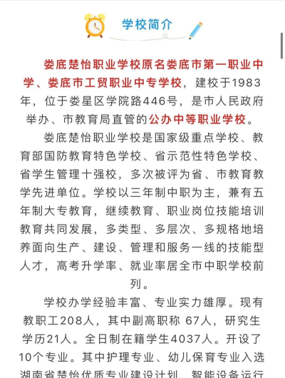 从以上4点我们可以看出,娄底市第一职业中学是一所具有较好办学情况的中专学校。中考结束同学们在填志愿时要多查资料多做比较,要详细了解学校的信息,盲目选择甚至乱选是对自己不负责任的表现。