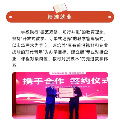 学校坚持与企业共同办学的教学理念,及时根据市场和企业对于人才的技能需求,增加实践课程,做到人才的精准培养。同时鼓励学生参加单招考试,提升学历,增加更多的学习机会,为企业提供更高层次的技能型人才。除此之外,学校秉承着立德树人的教学理念,开展了形式丰富的德育活动,组织学生参加各项系列活动,丰富学生的校园生活。学校实行全封闭、军事化管理,推行素质教育航天模式,着眼于学生的全面发展,加强专业建设,达到教学质量的稳步提高。