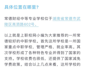 常德财经学校是经省人民政府审批、市政府主办学校,属于国家级重点中等专业学校。1980年建校,学校分为主校区和江北校区,主要推行开放式课堂教学,封闭式管理,强化学生们品德、气质修养,注重专业知识的学习和技能训练,切实培养实用型、技能型人才,获得了较好的社会口碑,吸引了韩国学生前来入学。