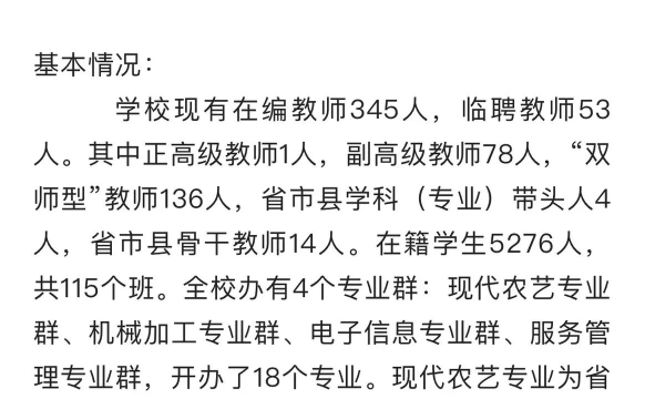 这所学校不断进行学校建设,从各方面培养学生的专业能力。加强学科建设,创建了智能制造、电子信息、服务管理、现代农业4个专业群,一共设立22个学科专业。学校的基础建设也值得一提,该校主要建筑有教学楼四栋,宿舍楼六栋,办公楼、信息楼、食堂、公租房各一栋。学校的这些建设,既保证了学生的学业,又保证了学生们的基本生活。