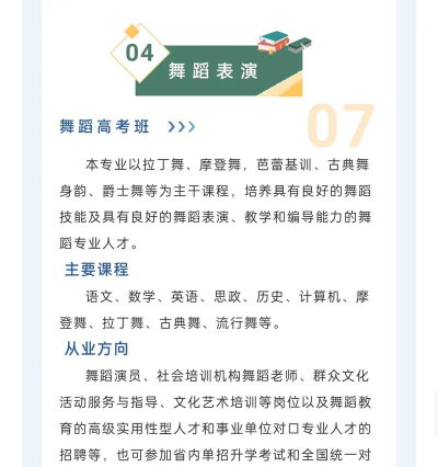 舞蹈,个子高挑的可以往舞台剧演员发展,个子娇小可以往艺考老师发展,还有培训班老师等,音乐,不太在乎身材样貌,只要有好嗓子会唱歌,都能在该领域展露头角。你可以往学校音乐老师、培训班老师:话剧演员、艺考老师、音乐调音师、音乐创作者等。