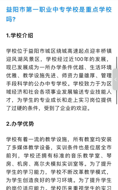 各专业实习实训设备齐全,实训条件居全市职业学校之首,现已发展成为一所办学条件优越、生活环境优雅、教学设施先进、师资力量雄厚、管理手段科学的中等职业学校,现为益阳市职业教育的排头学校。
