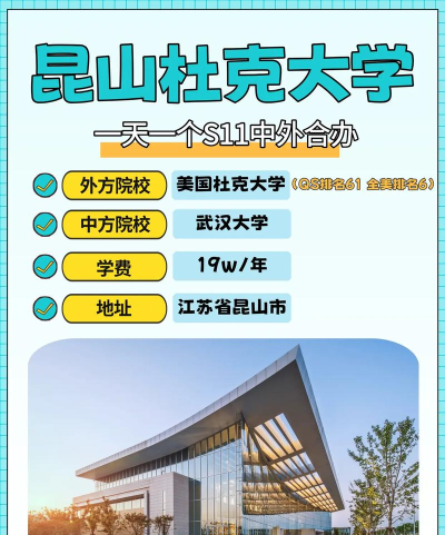 昆山杜克大学是由武汉大学与美国杜克大学联合创办的一所独立法人中外合作大学,昆山市人民政府为合作支持方。学校2013年9月获批正式设立,2014年8月开始硕士研究生教育和本科交换生项目,2018年正式开始本科学历教育。学校入选江苏中外合作办学高水平示范性建设工程,被列为全国首批国际合作教育样板区。