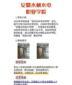 学院前身是始建于1952年的淮河水利专科学校,原属国家水利部直属。1958年扩建为安徽水利电力学院(本科)。1961年院校调整后,改名为安徽水利电力学校。1984年,经国家教委批准成立安徽水利职工大学。2000年6月18日,经安徽省人民政府批准由安徽水利电力学校、安徽水利职工大学、安徽省水利技工学校合并成立安徽水利水电职业技术学院。2004年经教育部、建设部确认为国家建设类技能型紧缺人才培养试点高校;[1]2010年学校通过国家教育部、财政部国家示范性高职院校建设计划项目建设验收,成为全国100所国家示范性高等职业院校之一。