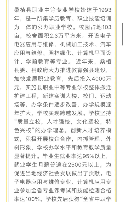 以上便是小编整理的桑植县职业中等专业学校的住宿环境,同学们可以作为参考,具体情况,同学们可以咨询学校招生老师,住宿条件越好的学校,收取的宿舍相关费用也就越高,同学们要根据自己的情况,去选择合适自己的学校。