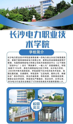 长沙电力职业技术学院是湖南省的电力类公办全日制普通高校,由湖南省电力公司主办,教育业务由湖南省教育厅管理。学院坚持依托行业,服务行业;对接企业,提升企业的办学定位,办学条件优越,专业特色鲜明,毕业生就业率稳居湖南省高职高专院校前列,获教育部人才培养工作水平评估优秀等级。学院设有经国家批准的职业技能鉴定站(所),承担了100个行业特有工种和22个社会通用工种的职业技能鉴定工作。