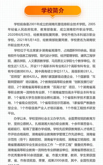 湖南软件职业学院坐落于毛泽东故里湘潭市,是经湖南省人民政府批准成立、国家教育部备案,纳入国家计划统一招生的全日制普通高等院校,全国三所IT类、建筑类人才培养的专业高等职业学院之一。