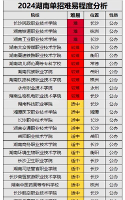 湖南单招最难的学校主要有三铁,即湖南铁道职业技术学院,湖南铁路科技职业技术学院和湖南高速铁路职业技术学院,其次是师范类专科学校,如长沙幼儿师范,湖南幼儿师范,湘中幼儿师范等,另外就是长沙民政,长沙电力职院,湖南工业职业技术学院等几所学校。