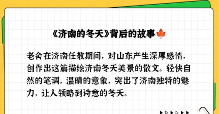 老舍在1924年赴英任教于伦敦大学东方学院,之后于1930年前后抵达山东,在济南齐鲁大学和青岛山东大学执教7载,对山东情深意重,称之为“第二故乡”。《济南的冬天》便是他在1931年春于济南齐鲁大学任教期间所创作。