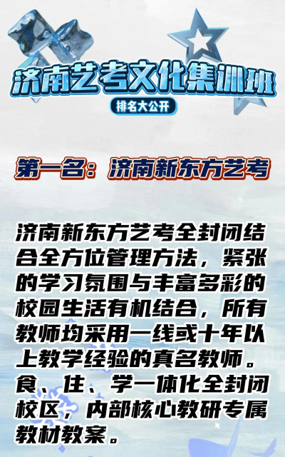 5、济南天艺之星艺术培训学校:始于1999年,现设多个分支机构,主要从事模特、空乘、舞蹈、表演等艺术专业高考培训。有专业的舞蹈教师和艺术指导团队,熟悉艺考的要求和流程,能够根据学员的实际情况制定个性化的培训计划。