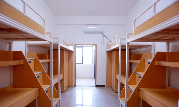 学生寝室是标准的学生公寓,卫生间、阳台、风扇、热水器等设施都具备,每个学生都有独立的书桌和衣柜,有设备完善的住宿条件。