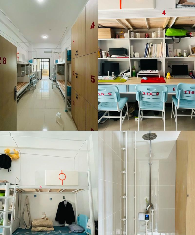 学生寝室是标准的6-8间,上下铺,寝室里配备有独立卫生间、阳台、电风扇、书桌书架、无线网络等设备,具体情况以学校安排为准。