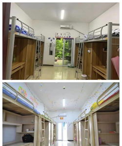 学校标准宿舍,上床下桌形式,内部配有桌子,衣柜,阳台等等,各项配套设施齐全,还可以安装无线网,为同学们日常的居住生活提供了不错的环境。