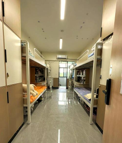 八人一间,上下铺。配备风扇。周边绿树成荫,冬暖夏凉。有网线,可以上网。
