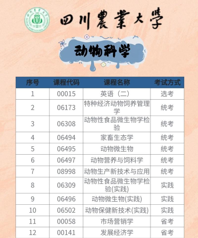《畜牧业经济管理》、《动物学基础》、《生物信息学》、《动物组织学与胚胎学》、《动物遗传学》、《动物解剖及组织胚胎学》、《动物性食品卫生学》、《动物繁殖学》、《动物生产学》、《动物微生物学》部分高校按以下专业方向培养:食品科学、设施畜牧业、饲料科学与工程、动物营养与食品安全、动物营养与饲料科学。