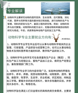 畜牧类企业:动物饲养、育种繁殖、动物营养、饲料工艺设计、饲料管理、产品加工;科研类单位:动物克隆、转基因动物;政府、事业类单位:动物资源调查、动物保护。