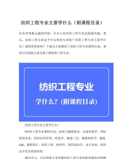 纺织工程主要研究纺织品的设计、加工工艺、质量检测、贸易等方面的基本知识和技能,包括纺织贸易和纺织服装两个方向,进行纺织品设计开发、纺织工艺设计、纺织生产质量控制等。常见的纺织品有刺绣、丝绸、服饰和地毯四大类,常用的纺织工艺包括清花、梳绵、并条、粗纱、细纱等。