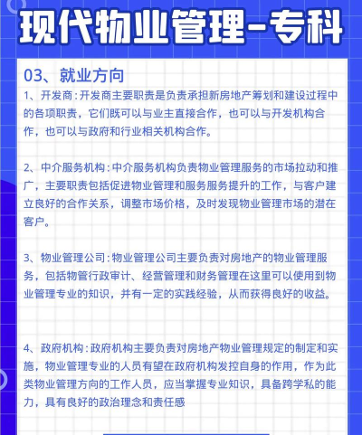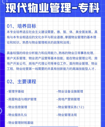 培养要求:本专业学生主要学习物业管理的基本理论和相关知识,接受系统的物业管理系统运营与管理的基本训练,掌握解决物业管理具体问题的基本能力。