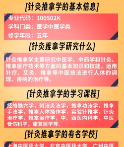 专业核心课程:中医基础理论、中医诊断学技术、中医内科学、经络与腧穴、针法灸法、推拿手法、针灸治疗技术、推拿治疗技术。