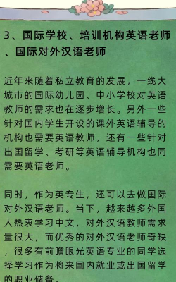 教育类机构:外语教师、口语培训、咨询顾问;外贸类企业:文秘、外贸业务员、外语翻译、商务贸易。