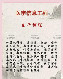 主要课程:计算机科学、医药学、电路、模拟电子技术、数字电子技术、电磁场与电磁波、信号与系统、数字信号处理、数据结构、操作系统、微机原理及应用、程序设计语言、数据库技术、生理解剖、医学信息、医学传感检测、医学仪器、医学信号及图像、生物系统及建模、计算机网络与通信控制系统等 。