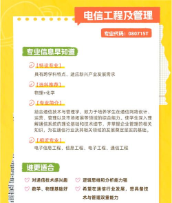 电信工程及管理主要研究通信技术和通信网方面的基本知识、组成原理和设计方法,涉及光波、无线、多媒体等多种通信技术,进行现代通信系统和网络的设计、运营和管理等。例如:5G网络的开发,卫星通信系统的维护,光纤网络的搭建,路由器的设计研发等。