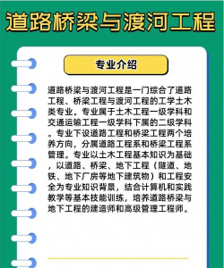道路桥梁与渡河工程主要研究道路工程、桥梁工程、地下工程等方面的基本知识和技能,进行道路和桥梁的规划、设计和建造等。例如:道路的翻修施工,立交桥的设计建造,路基路面的勘测,道路周边景观的设计等。