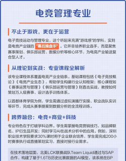 电子竞技运动与管理主要研究游戏品种研发、IP赛事活动打造、专业战队运营、衍生产品开发、关联产业服务发展等,培养承担电竞产业中的教育培训、赛事组织、企业管理、俱乐部管理等工作的专业复合型人才。
