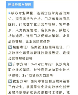 专业核心课程:连锁经营管理实务、服务管理实务、门店营运实务、品类管理、采购与供应链管理、连锁门店开发与设计、特许经营实务、数字营销基础。