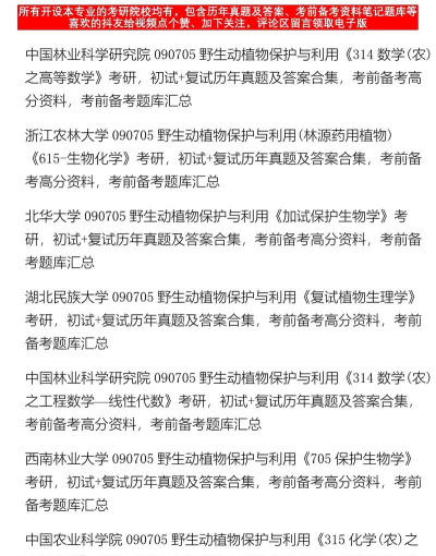 接续普通本科专业举例: 野生动物与自然保护区管理、动物科学、经济动物学、动 植物检疫、森林保护、林学