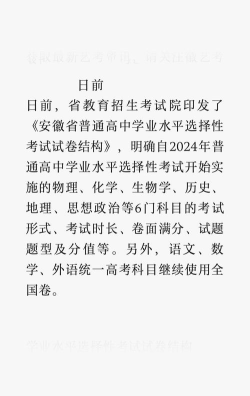 省教育招生考试院组织专家制订了《安徽省普通高中学业水平选择性考试试卷结构》(以下简称《试卷结构》),作为考试命题的依据,从2024年普通高中学业水平选择性考试开始实施。