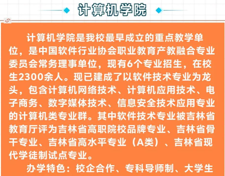 学院开设计算机软件技术、网络技术、计算机多媒体技术、电子商务等四个专业。学院位于长春国家级高新技术产业开发区(长春高智力密集区,区内拥有24个大专院校和39个科研院所,有近20万科技人员在此工作)软件园,邻近吉林大学南湖校区和前卫校区。占地面积10万平方米,校舍建筑面积83648平方米,多媒体教室17个,计算机教室78个,电子试验室2个,电脑3000多台。
