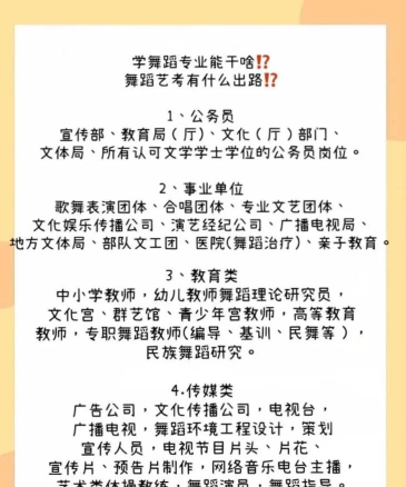 舞蹈学专业毕业生认为该专业发展前景很好和比较好的比例为19%,36%的毕业生认为该专业发展前景为不太好”或很不好”。按照10分制进行计算,该专业的发展前景指数为5.54,与其他大学专业相比,发展前景指数为中等偏下。