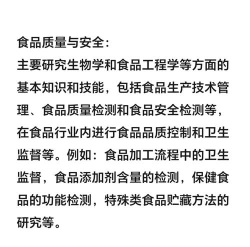 可在食品领域从事技术研发、分析检测、安全评价、质量管理、品质控制等方面的工作。
