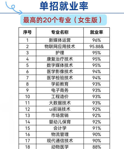 高职单招适合女生读的专业有很多,男生女生在性格、学习、思考等诸多方面都有其较大的差异性。在一些传统专业和新兴专业中由于劳动强度和工作环境的限制,不适合女生去选择。