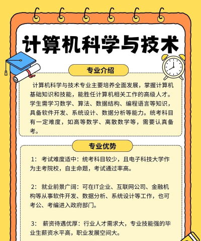 大学的计算机科学与技术专业,是许多即将上大学的学生梦寐以求的。它主要分为两个方面,一是科学,侧重于从现象中提取规律,大学时如果对这方面感兴趣,可以深入学习考取研究生,对计算机科学进行深入研究。另一方面是技术,主要侧重于研制计算机,主要是硬件层面,还有就是研究使用计算机进行信息处理的方法和技术手段,这属于网站层面的技术,毕业后可以从事网站开发等工作。