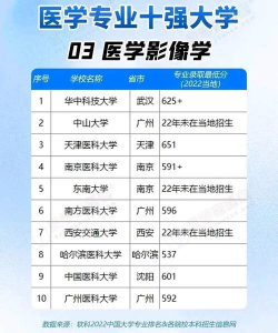 顶尖院校:未具体提及,医学影像学专业的排名与影像医学院校的教学和研究水平相关