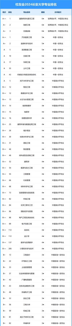 长安大学作为一所以交通运输工程为特色的综合性大学,拥有多个优势专业。根据提供的信息,以下是长安大学一些专业排名的概览: