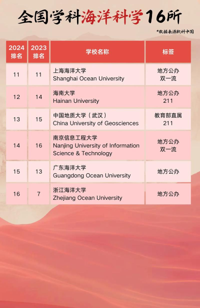 根据2024年的最新排名,以下是海洋科学专业全国部分高校排名情况: