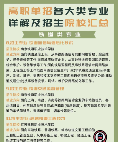 铁路专业对于有意向进入铁路行业的男生来说,是一个具有较好就业前景的领域。不过,值得注意的是,就业机会和薪资待遇也与个人能力、专业素质及所在地区有关,因此不断提升自身竞争力是关键