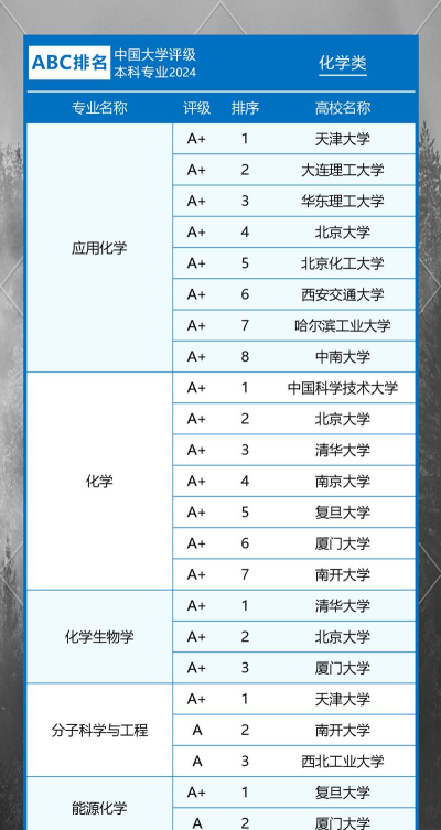 以上排名信息根据软科发布的2024年最新化学类专业排名整理得出,排名综合考虑了学校、学科、专业三个层次的评价。排名中,多数院校的化学专业评级为A+。