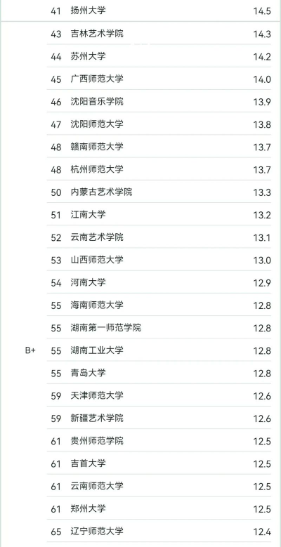 音乐学专业:中央音乐学院、中国音乐学院、上海音乐学院、东北师范大学、首都师范大学、福建师范大学、南京艺术学院、中央民族大学获得A+评价。