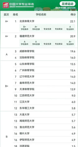 体育学院王牌专业的排名可能会根据不同的评价标准和时间点有所变化。以下是一些体育学院的王牌专业排名信息,这些信息基于不同时间点发布的数据: