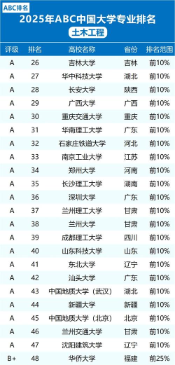 根据最近的信息,以下是部分中国土木工程专业的排名情况: