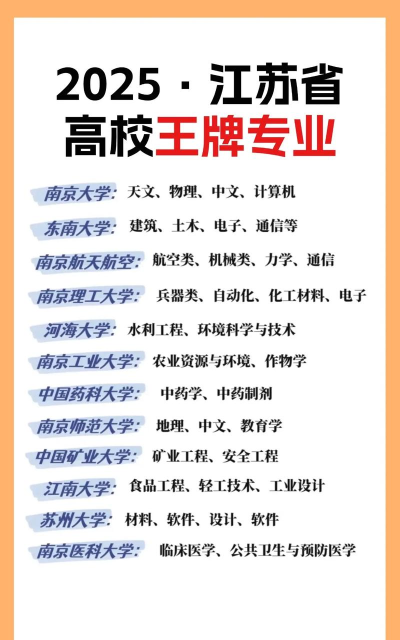 江苏省拥有众多知名高校,它们在各自的领域有着显著的优势。以下是部分江苏高校的优势专业排名信息: